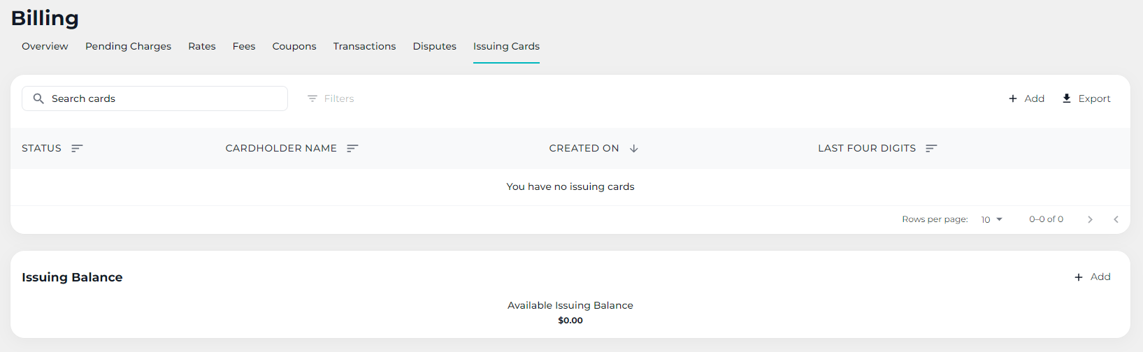 * You are able to [fund](https://documentation.movatic.co/admin-site/billing/issuing-cards/fund-balance) the issuing balance.&#x20;