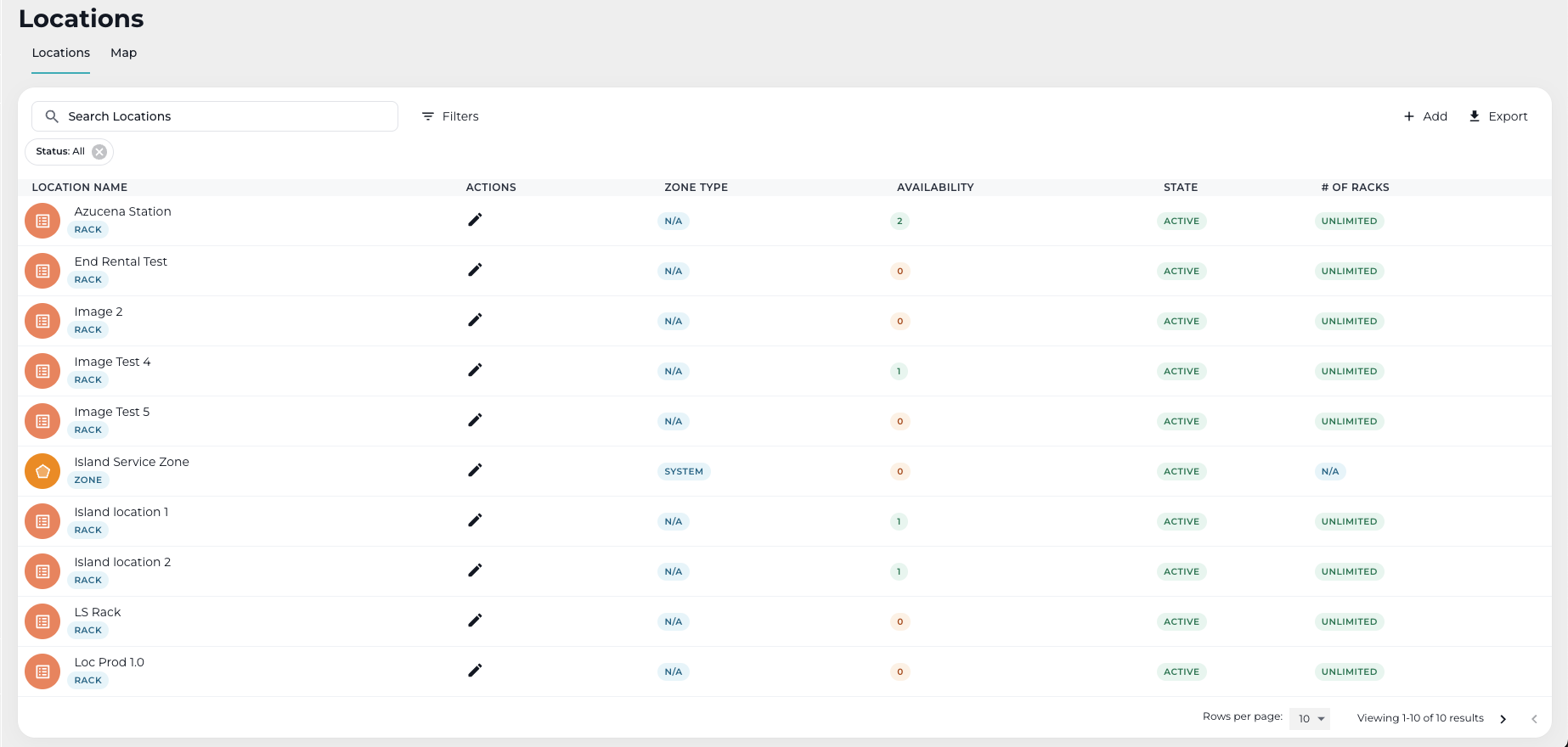 The **Locations** section is everything you see on the Map, in text form. The actual name of the location categorizes information in this tab, an Actions tab where you can edit details, a Zone type ([zone ](https://documentation.movatic.co/admin-site/locations/zones)or a [rack](https://documentation.movatic.co/admin-site/modes/racks)), the amount of hardware available, or the status of the hardware (Active, inactive, unassigned, or under maintenance).&#x20;