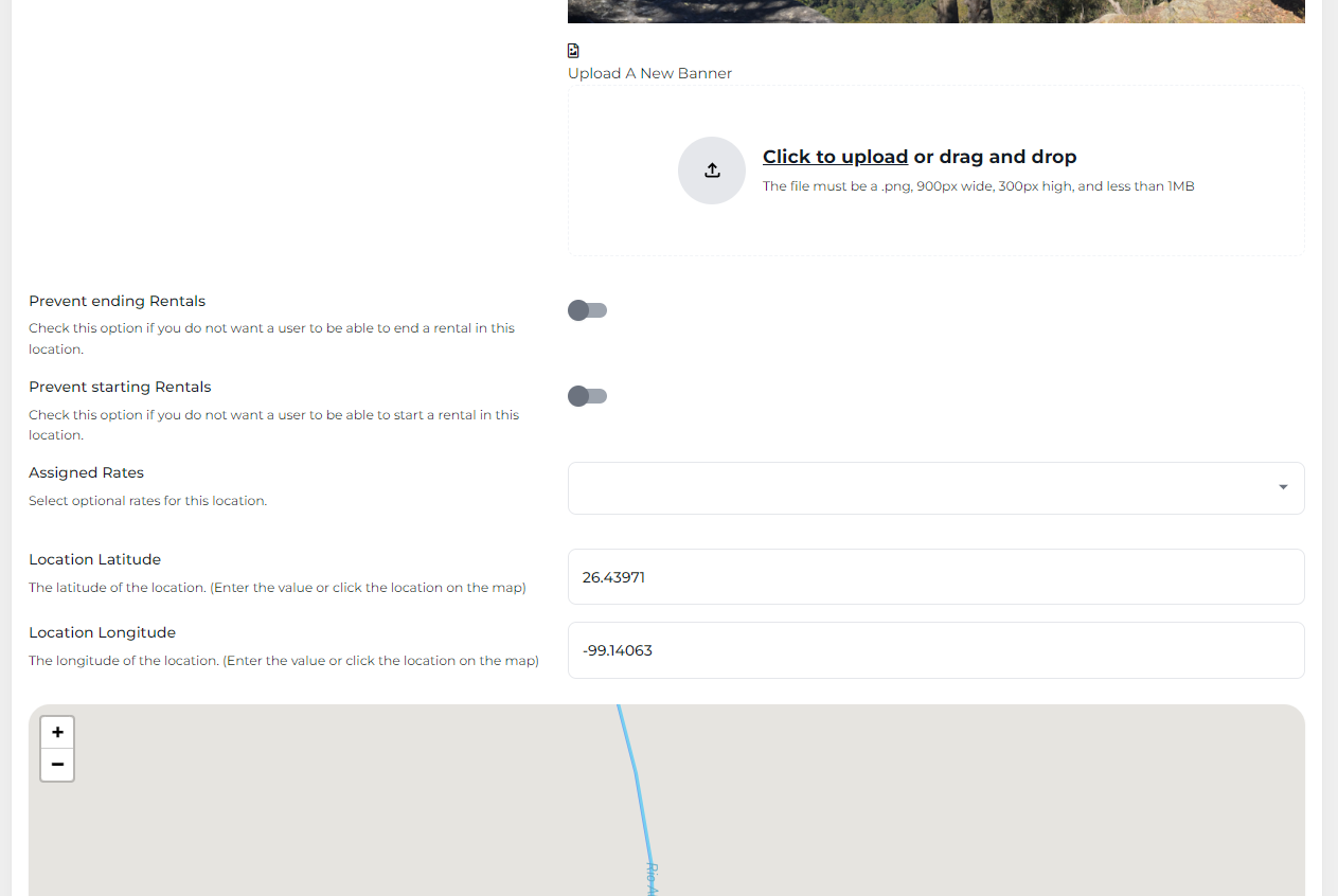 Clicking the Pencil button under the Action category will route you to a page where you can edit Location details. It will allow you to modify the location name and status, radius for the zone, access restrictions (public/private), banner, rates, and the location on the map. When you are done making changes, click the submit button.