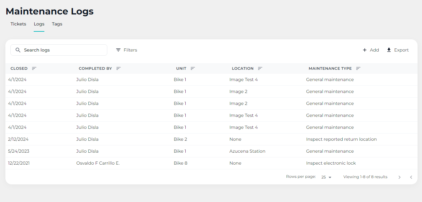 When you click on a specific ticket, it will display the maintenance type, the date it was completed, the priority of the issue, the time taken to resolve the issue, name of mechanic who completed the log, bike number and location of hardware.