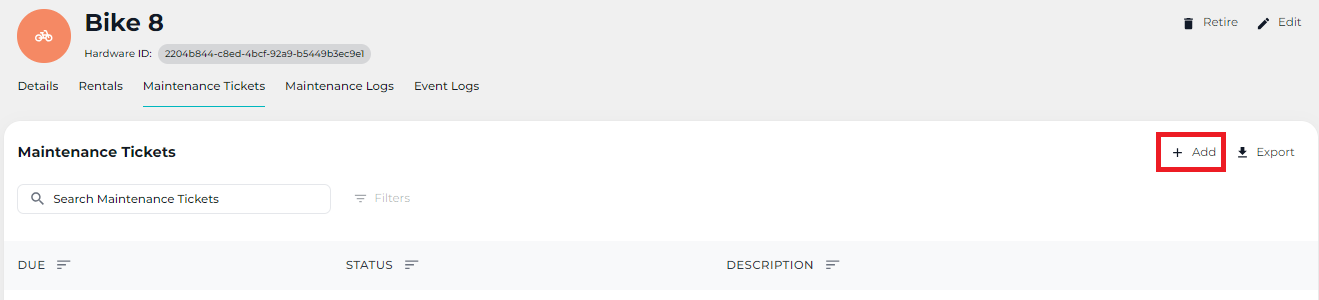 To create a new maintenance ticket, simply click the +Add button located in the upper right corner. Additionally, you can export information about all maintenance tickets associated with this specific hardware by clicking the Export button beside the +Add button.