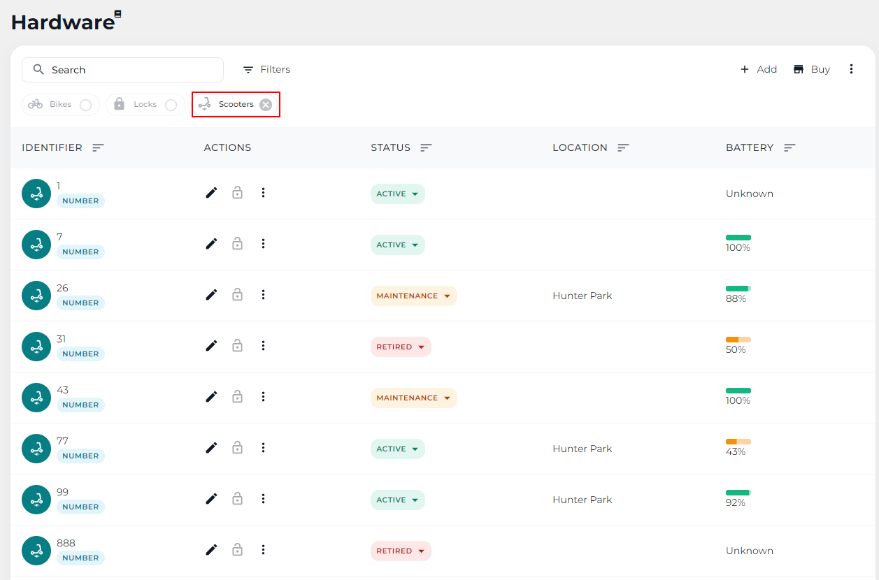 On the upper right-hand side, you also have the option to add new scooters by clicking the **+ Add** button. To learn more about how to add a scooter make sure to visit our [Hardware Set Up](https://documentation.movatic.co/admin-site/modes/add-a-new-hardware) page.