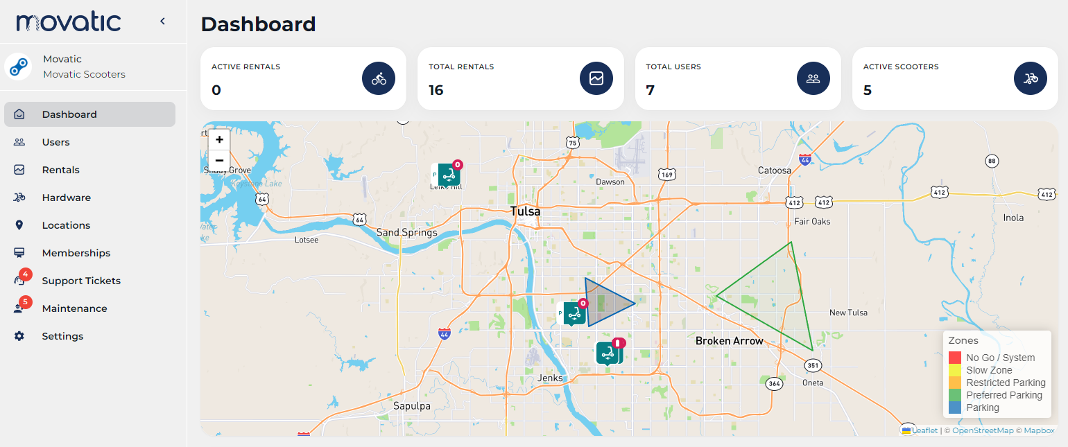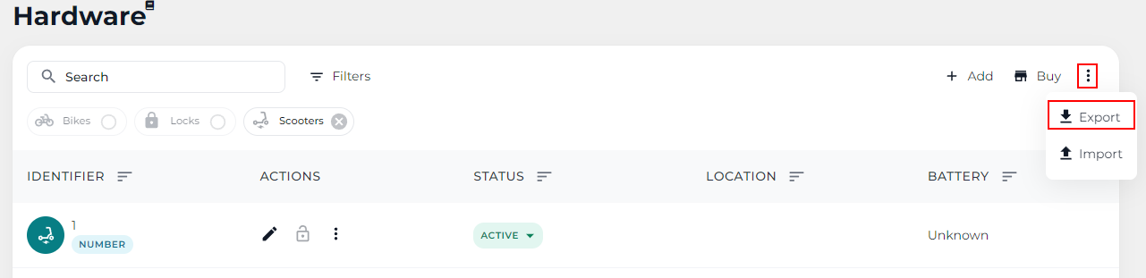 The **Scooters** section can be found by clicking on [**Hardware** ](https://documentation.movatic.co/admin-site/modes)on the left side of your dashboard. This section displays each individual scooter in your system by its assigned scooter number. You can see the status of the scooter as well as the location, battery percentage, remote option to lock, unlock or ring the scooter.