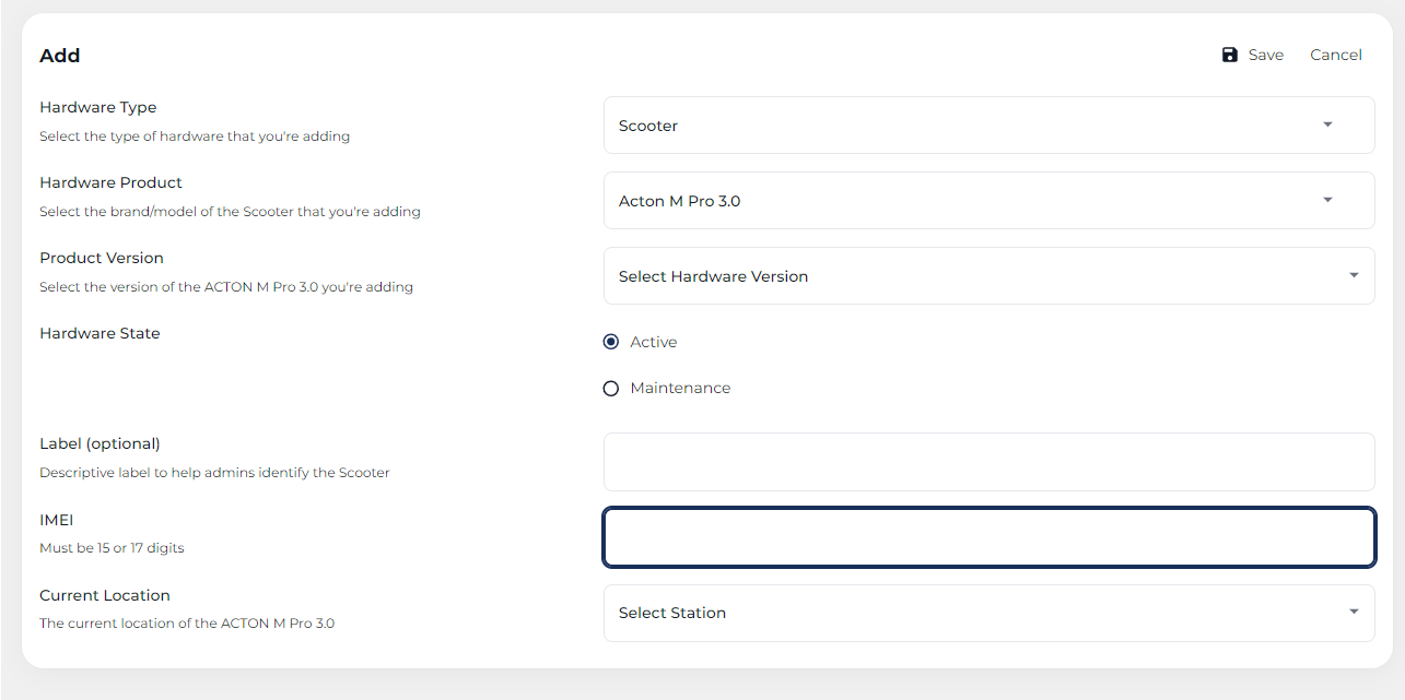4\. Add your hardware info (IMEI) into the Movatic dashboard along with the other required fields. When you are finished, click the submit button. Follow this [link](https://documentation.movatic.co/admin-site/modes/scooters/supported-scooters/broken-reference) for hardware setup. \