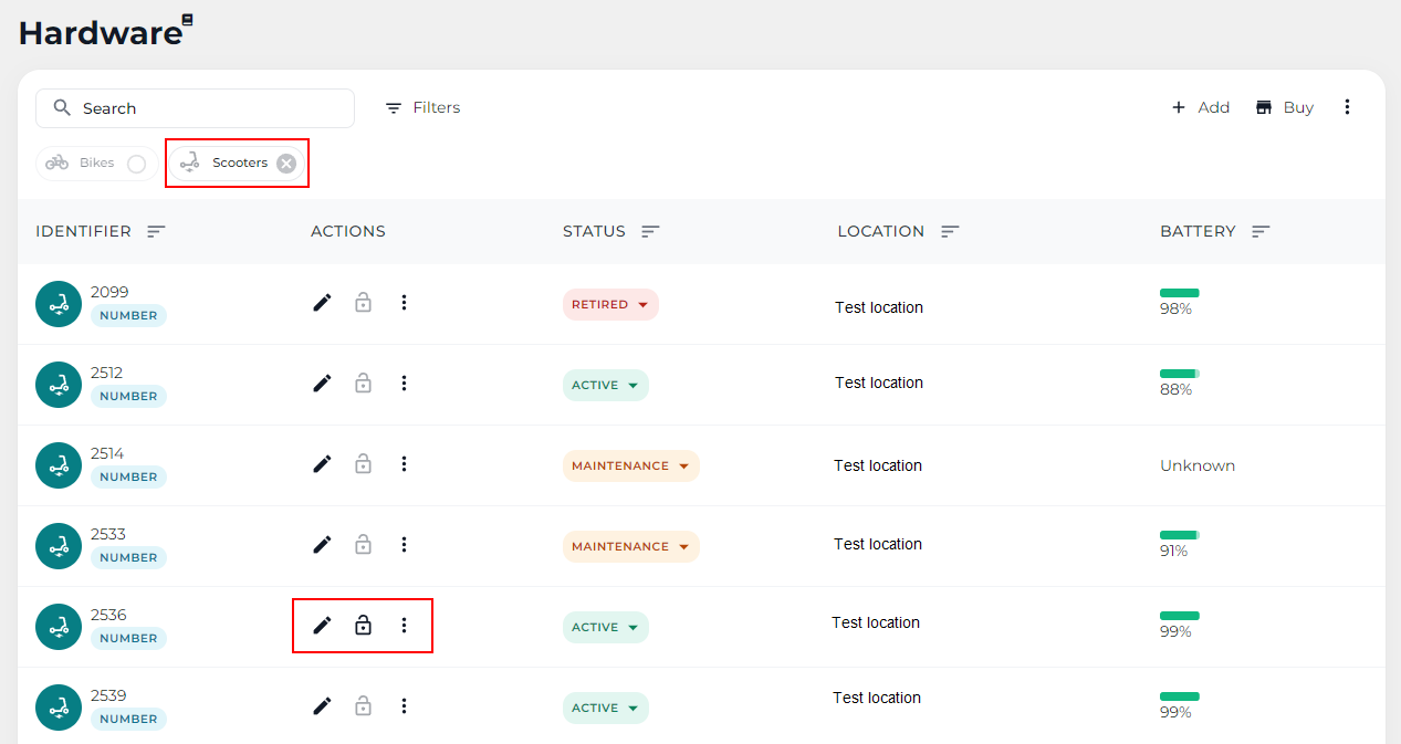 6\. You'll be able to confirm your scooter's connectivity by going to your Movatic admin dashboard and selecting 'scooters' from the filtering button below the Search bar.