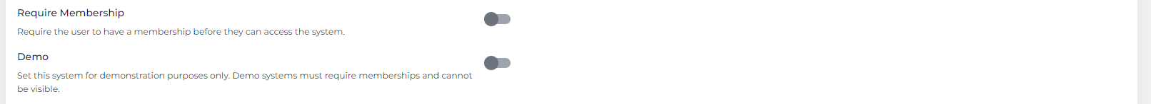 The '**Demo**' option is used solely for demonstration purposes such as showcasing features and usability in the admin platform. Demo systems **aren't visible** without a membership in the system.