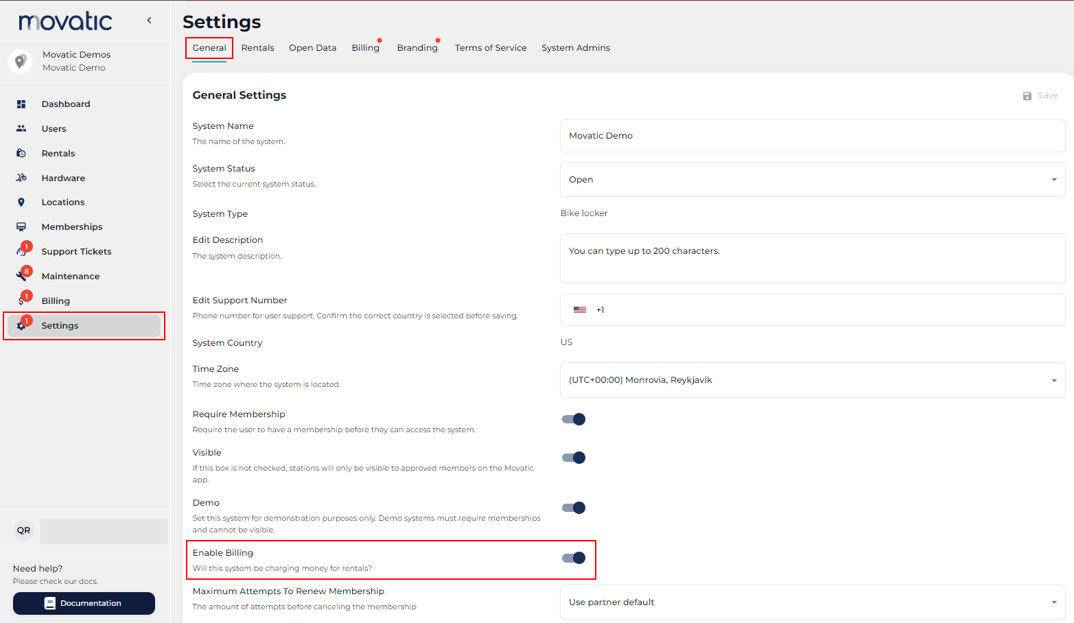The '**Enable Billing**' option should be turned on for any system that will be making charges to users. Once this option is checked, the **Billing** section will appear on the main menu and will also appear as a tab in **Settings**. The [**Billing section**](https://documentation.movatic.co/admin-site/settings/billing) is where you can customize [**rates**](https://documentation.movatic.co/admin-site/billing/rates), [**coupons**](https://documentation.movatic.co/admin-site/billing/coupons), and view [**transactions**](https://documentation.movatic.co/admin-site/billing/transactions).