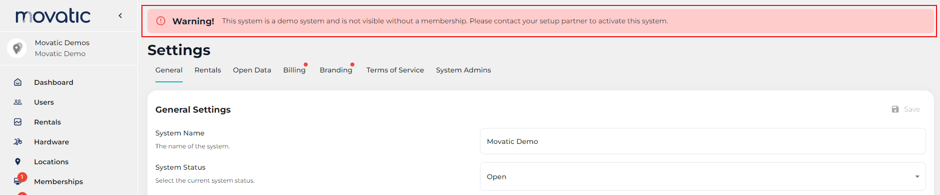 2. Generate a free [membership](https://documentation.movatic.co/admin-site/memberships) for the system. By default, new systems operate in demo mode and require memberships. You can identify if your system is in demo mode by checking the settings, where you will encounter the following warning message: *"This system is a demo system and is not visible without a membership. Please contact your setup partner to activate this system."*<br>